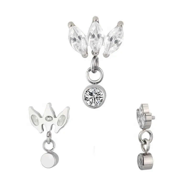 Élevez votre style avec ce bijou de piercing raffiné et délicat. Le design arbore trois cristaux en forme de marquise, subtilement disposés pour former une couronne lumineuse, ainsi qu’un cristal rond suspendu pour un effet élégant et en mouvement. Ce modèle est fabriqué en titane ASTM F-136. Disponible en PVD Gold ou argenté pour s'adapter à tous les goûts.