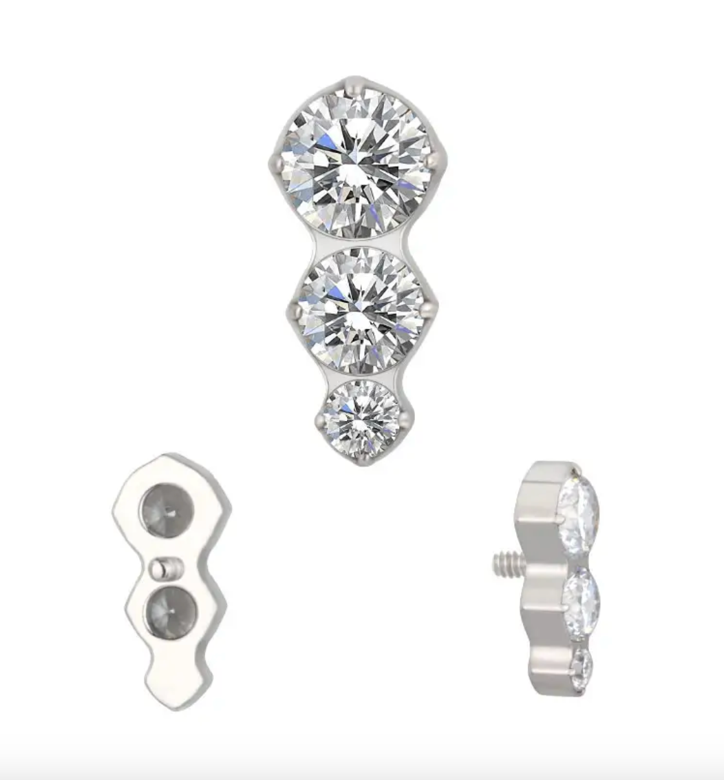 Ajoutez une touche d’élégance intemporelle à votre collection avec ce piercing en titane ASTM F-136. Son design épuré met en valeur un trio de zirconiums premium parfaitement alignés, créant un effet lumineux et raffiné.