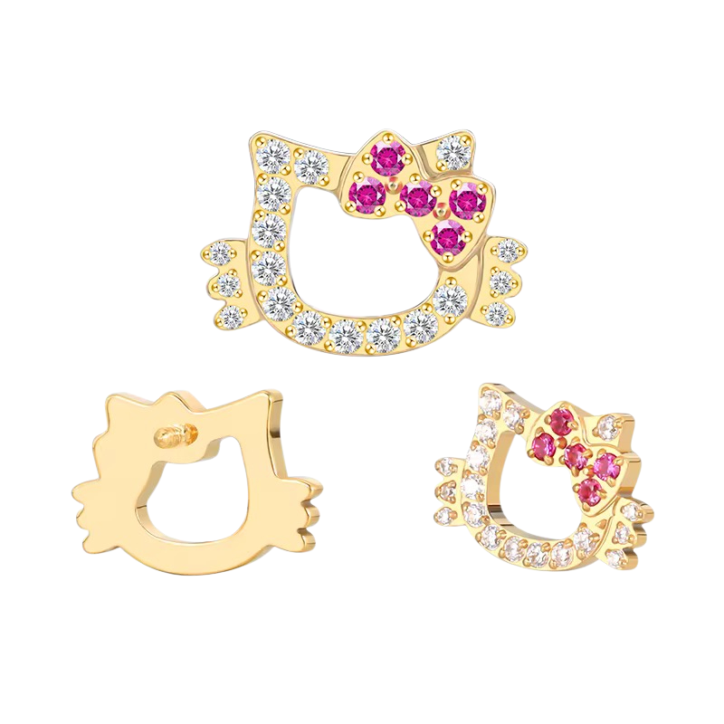 Piercing hello kitty en titane ASTM F-136 dorée avec zirconium premium blanc et fuchsia.