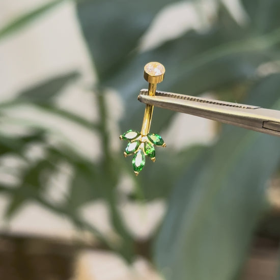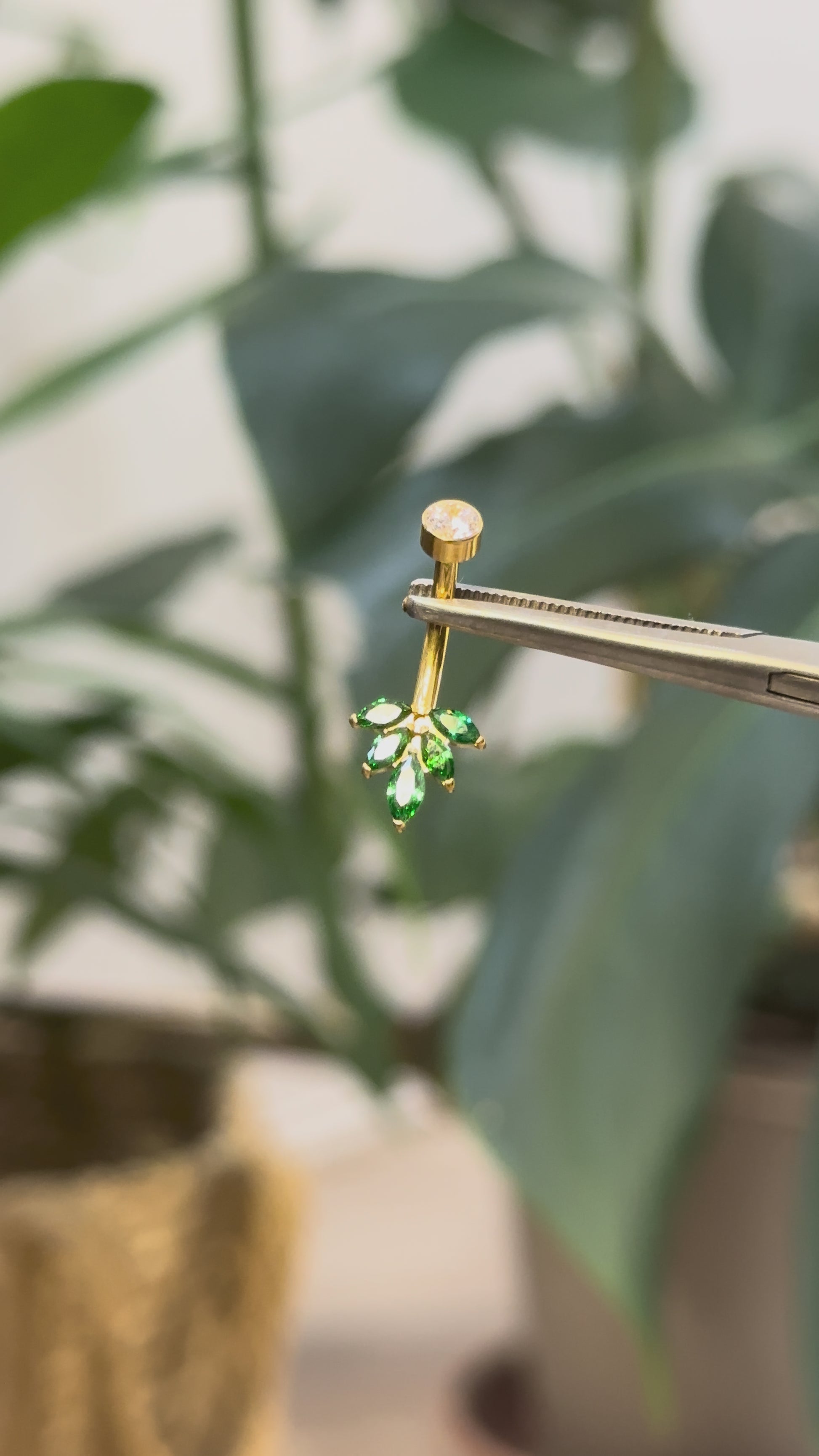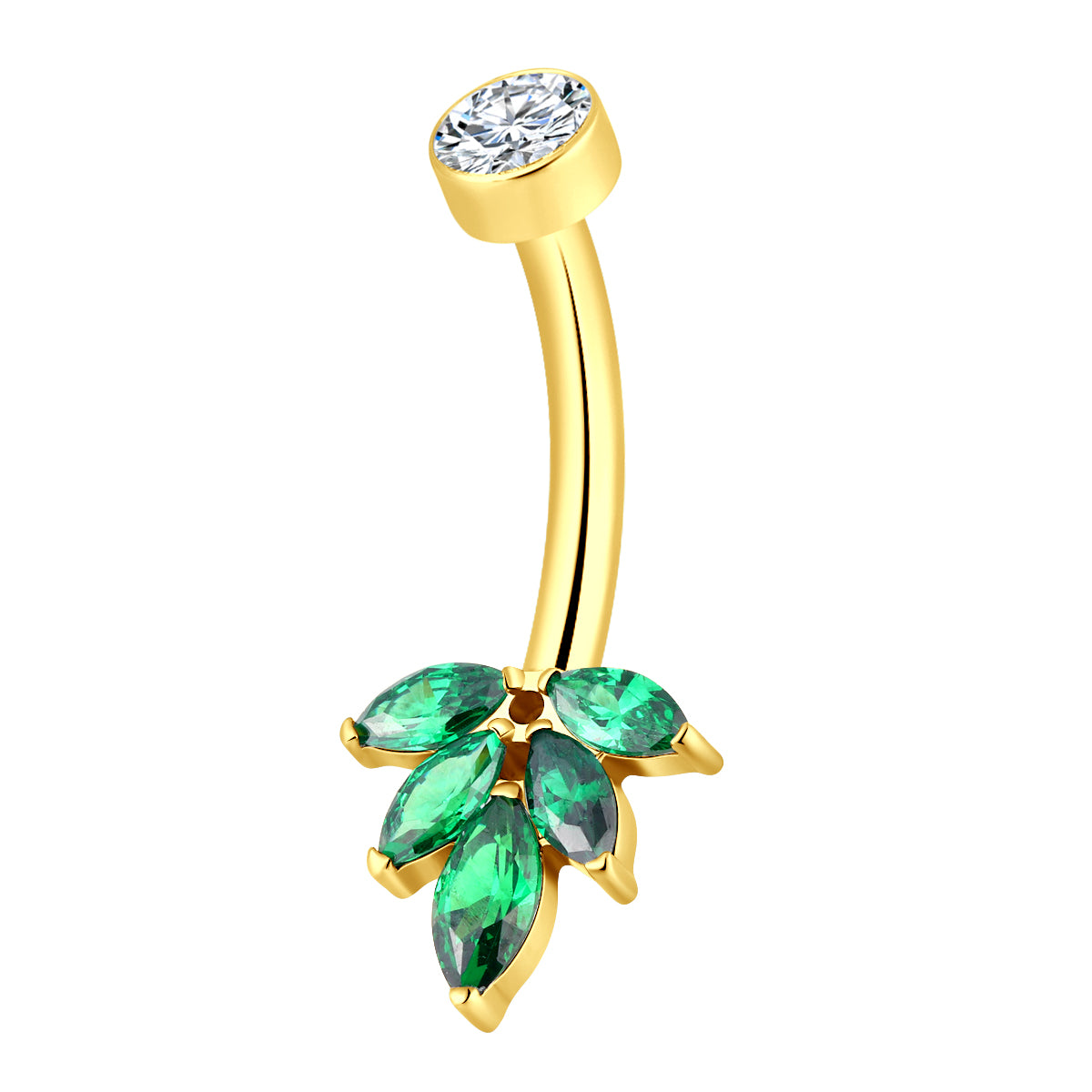 Piercing nombril titane ASTM F-136 dorée avec zirconium vert émeraude et blanc.
