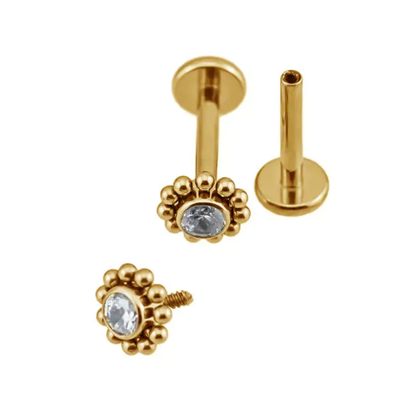 Piercing fleur rétro en titane ASTM F-136. Disponible en doré et argenté. Zirconium premium.